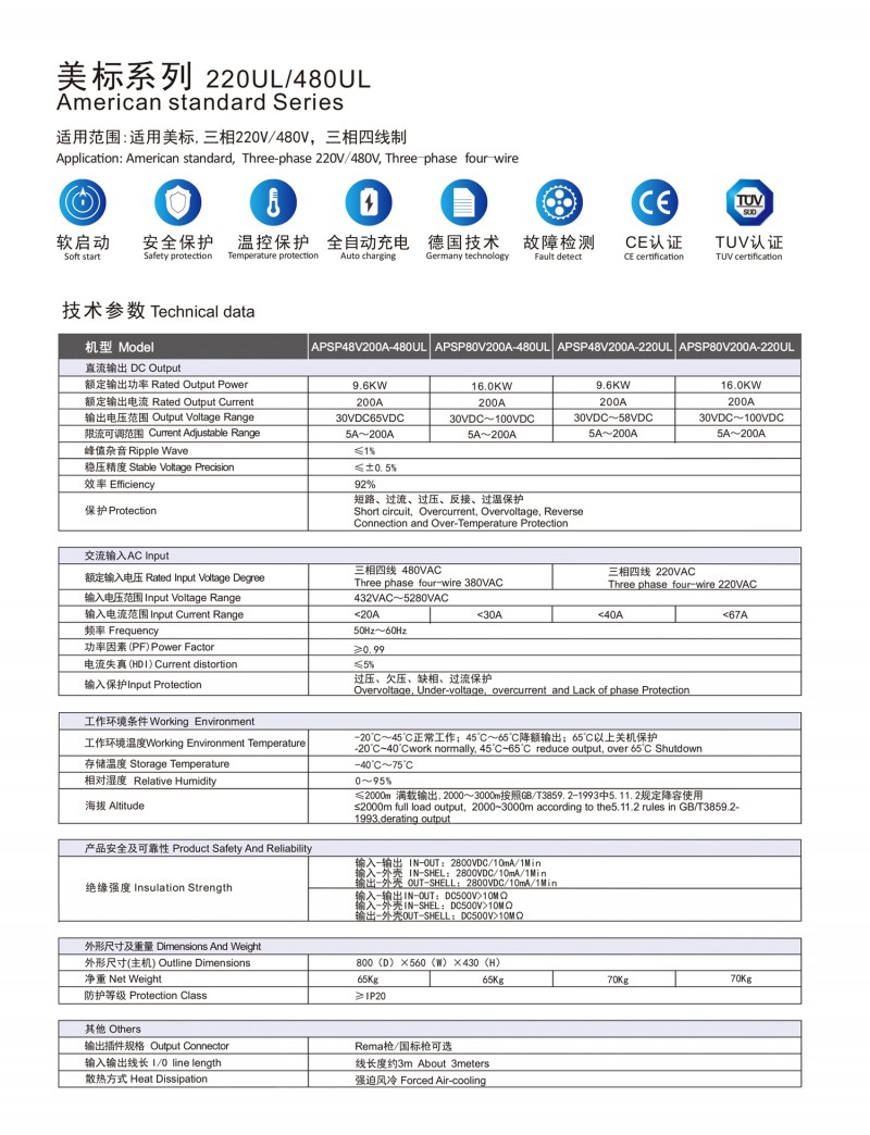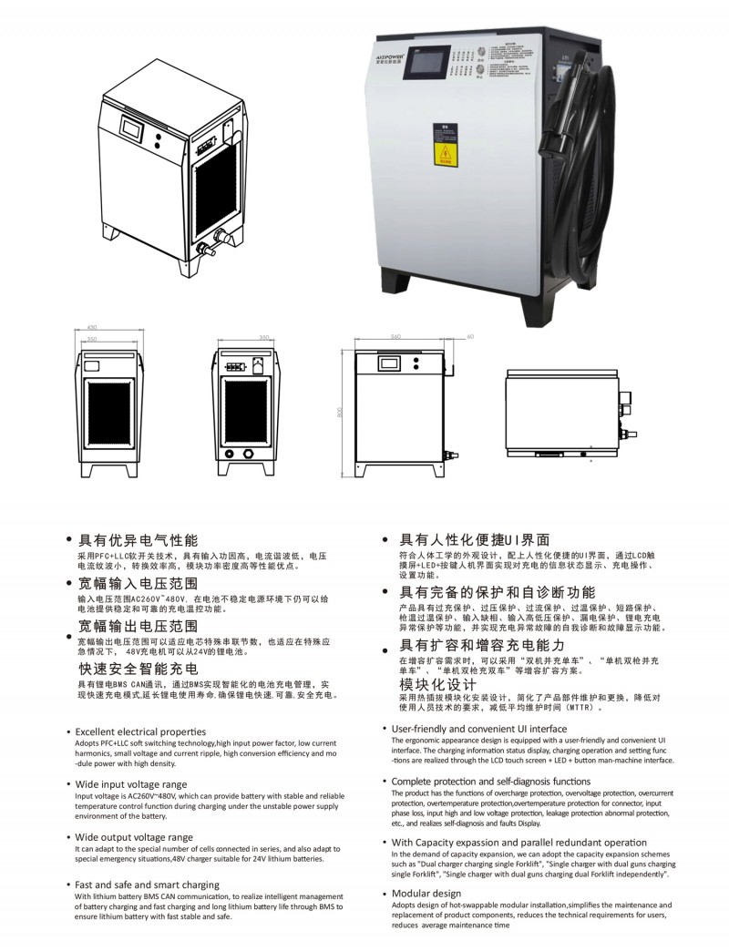 觸摸屏智能操作設(shè)計:告別傳統(tǒng)按鍵方式,給您帶來更現(xiàn)代更具科技智能的操作體驗 自動充電:插槍自動充電,簡化充電流程,便于操作 兼容性高:80V200A兼容48V200A充電 多重保護(hù): 輸出短路,過流過壓保護(hù),反接保護(hù),電流導(dǎo)管保護(hù)等多重保護(hù) 預(yù)約充電功能:避開高峰用電時段,有效節(jié)省成本 雙語切換:中英文雙語隨需切換,跨越語言障礙,與世界接軌 人性化設(shè)計:充電機(jī)背板內(nèi)部附部件明細(xì)及產(chǎn)品接線圖,方便客戶可更清楚的了解產(chǎn)品,便于維修,提高售后時效 獨(dú)特設(shè)計: 內(nèi)置電磁鎖驅(qū)動模塊,防止臨時斷電鎖槍 使用壽命更長:功率模塊預(yù)留20%空間,提高模塊的使用壽命 出色內(nèi)部結(jié)構(gòu): 內(nèi)部結(jié)構(gòu)左右出風(fēng),內(nèi)部電路不容易積粉塵,提高充電機(jī)壽命