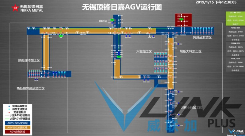 無(wú)錫頂鋒日嘉為提高物料和在制品的流轉(zhuǎn)速度,要求物料及在制品的運(yùn)輸全面采用AGV調(diào)度系統(tǒng)自動(dòng)運(yùn)輸。通過(guò)威聯(lián)加AGV智能調(diào)度系統(tǒng)的實(shí)施,實(shí)現(xiàn)AGV運(yùn)輸?shù)撵`活調(diào)度和線路優(yōu)化,大幅度提升物流的效率,實(shí)現(xiàn)快速精準(zhǔn)運(yùn)輸。路線設(shè)計(jì)根據(jù)現(xiàn)場(chǎng)狀況設(shè)計(jì)3種類型的行駛路線:AGV正常行駛區(qū)域、AGV動(dòng)態(tài)加速區(qū)域、AGV充電區(qū)域,在行駛的路線上通過(guò)各節(jié)點(diǎn)的不同功能指導(dǎo)小車的行駛路線。