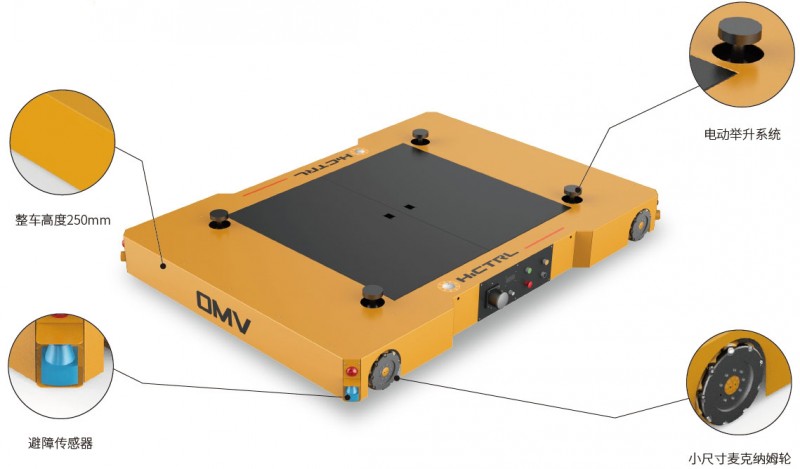 OMV潛伏背負式機器人整車采用低結構設計、高度僅為250mm,利用麥克納姆輪實現零回轉半徑、側移、全方位無死角任意漂移。可方便的潛入各類工件托盤下。穿行于托架之間、在狹小空間內全方位無死角任意漂移。通過加裝電動舉升系統,即可實現整體搬運各種工裝及部件。實現對接、裝配等復雜工作。