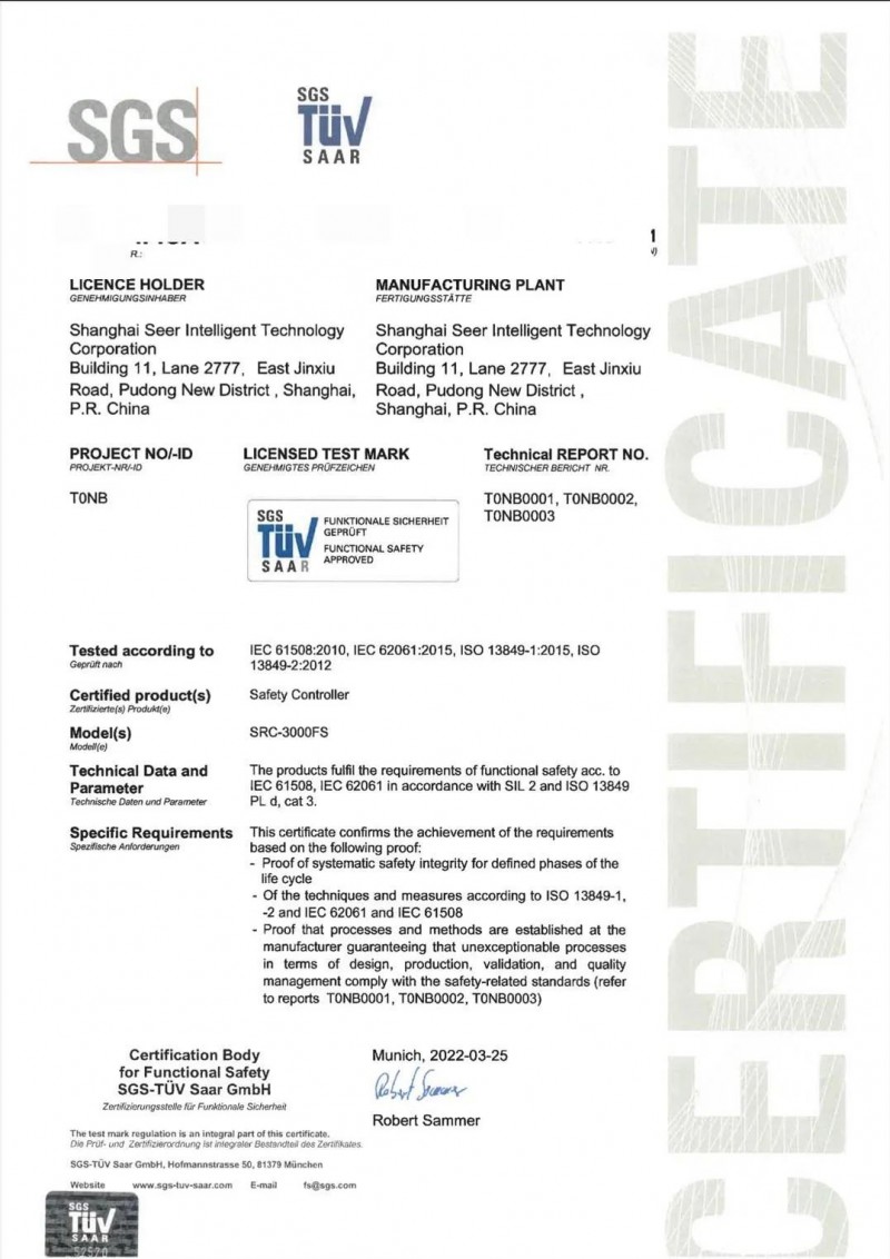 (SRC-3000FS 的 SGS 功能安全證書)