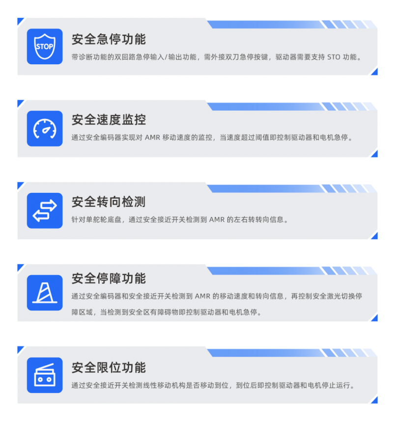 這就意味著通過 SRC-3000FS,無需安全“PLC”,即可搭建滿足 ISO 3691-4 國際安全標(biāo)準(zhǔn)的 AMR!由 SRC- 3000FS 打造的 AMR 性能強(qiáng)悍的同時空間更加緊湊,這不僅降低造 AMR 的難度,還能為客戶提供更多樣的造車選擇,為國產(chǎn) AMR 提供強(qiáng)有力的技術(shù)支持,促進(jìn) AMR 行業(yè)繁榮發(fā)展!