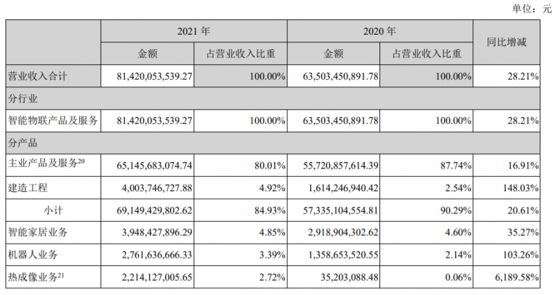 2015年以來,海康威視鼓勵內部員工創新創業,建立內部創新跟投制度,先后成立了8個創新業務。2021年,有5個創新業務的收入超過10億、凈利潤為正。其中,公司智能家居業務營收達到了39億元,同比增長35.27%、機器人業務營收達到了27億元,同比增長103%、熱成像業務營收達到22億元、同比增長6189.58%。年報顯示,螢石網絡已經遞交IPO申請;海康機器人擬分拆上市,相關籌備工作正在推進中。