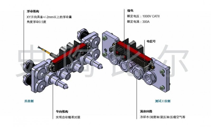 然而,由于在自動測試線上,采用單回路分別連接極其低效且易出錯,與自動測試快節(jié)奏和低容錯的要求不能完美適配,因此能將多回路(包括水、油、氣、電)一次性集中連接的組合連接器也就成為了自動測試線上的剛需產(chǎn)品——即將電驅(qū)動上的強電、信號、冷卻液、潤滑油等回路集中連接至“托盤快速連接器”,“托盤快速連接器”與各測試工位側(cè)的“臺架連接器”自動對接,保障回轉(zhuǎn)式自動測試線體順利運行。