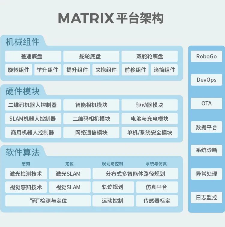 MATRIX,譯作“矩陣”,常見于應(yīng)用數(shù)學(xué)、計(jì)算機(jī)、物理等學(xué)科,是機(jī)器人的AI核心技術(shù)支撐。如果把極智嘉機(jī)器人產(chǎn)品比作枝葉和果實(shí),那么MATRIX平臺(tái)就如同樹干,就是極智嘉全產(chǎn)品矩陣的發(fā)展根基。