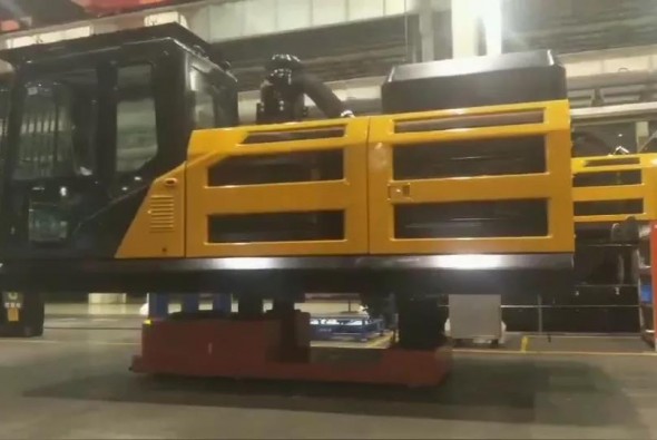 大挖工廠使用國(guó)自20噸重載AGV+30噸RGV,串聯(lián)起產(chǎn)線裝配工位,實(shí)現(xiàn)上線、下線全程智能化調(diào)度。