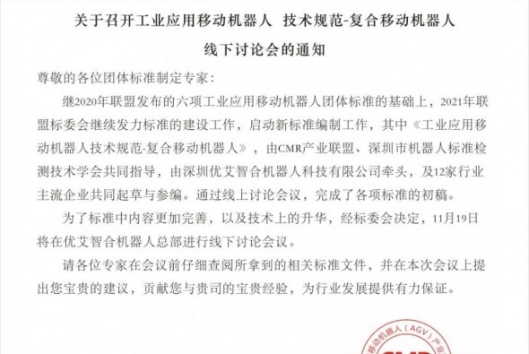 關(guān)于召開《工業(yè)應(yīng)用移動機器人 技術(shù)規(guī)范-復(fù)合移動機器人》線下討論會的通知