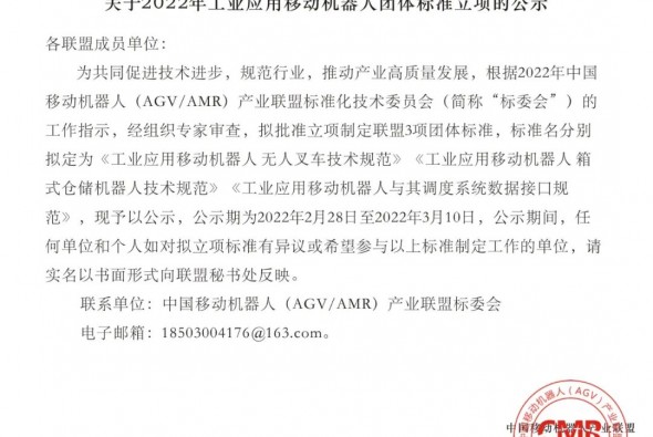 關(guān)于2022年工業(yè)應(yīng)用移動機器人團體標(biāo)準(zhǔn)立項的公示