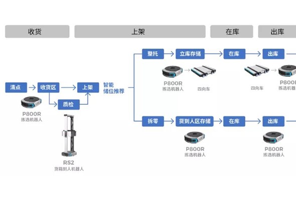 由RS5貨箱機(jī)器人、P40貨到人機(jī)器人、四向穿梭車(chē)及AI算法和智能倉(cāng)庫(kù)管理系統(tǒng)(WMS)構(gòu)成。