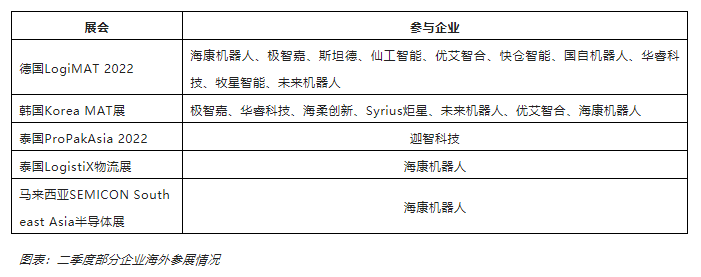 二季度,海外比較受關(guān)注的展會(huì)如德國LogiMAT 2022及韓國Korea MAT展都吸引了不少國內(nèi)企業(yè)的參與,如海康機(jī)器人、極智嘉、斯坦德、仙工智能、優(yōu)艾智合、快倉智能、國自機(jī)器人、華睿科技、牧星智能等,都攜旗下代表性產(chǎn)品及方案一一亮相。