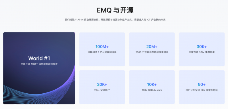 結合多年來服務企業數字化轉型的實踐經驗和全球領先開源先進理念,EMQ 在開源社區治理、開源實踐和商業化等領域均獲得了不錯的成效。EMQ 發起并維護的開源項目——物聯網消息服務器 EMQX,在同類型開源項目中排名全球第一,全球下載量已超 2000 萬次,連接了超過 1 億臺的物聯網設備,每月全球活躍集群部署超過 3 萬個。