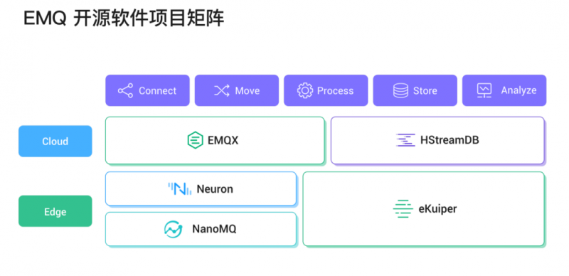 在云端,EMQ 通過開源模式打造了極具世界競爭力的物聯網消息中間件項目 EMQX 和流數據實時處理的數據庫軟件 HStreamDB。