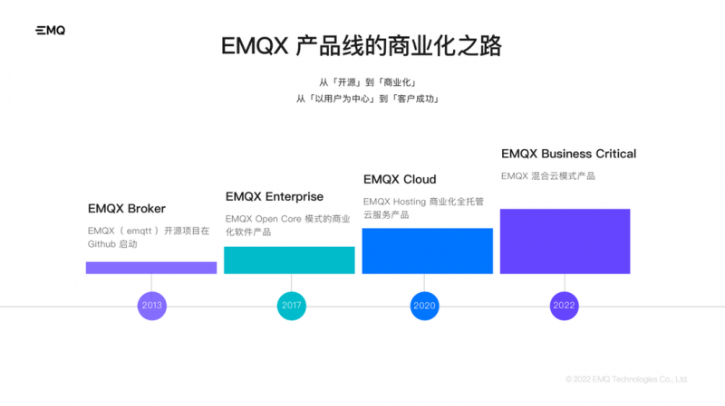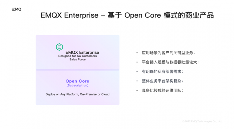 此外,EMQ 基于 EMQX 開源項目還開發了私有部署版  EMQX Enterprise,基于 Open Core 模式的商業產品,主要技術優勢在于高并發、高擴展性、大吞吐場景下保持長久穩定的數據接入服務。為不同類型和規模的企業客戶構建關鍵業務的物聯網平臺與應用。