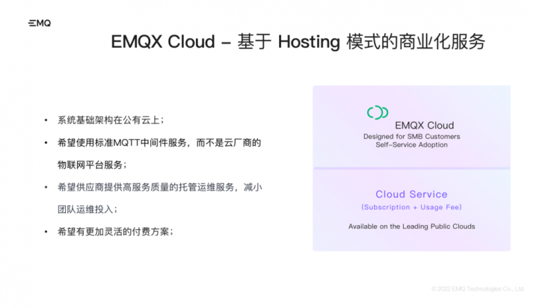 目前來說用戶對云服務的模式普遍是比較接受的,因為這樣的服務是開箱即用的,可以免去用戶對軟件的運維和維護。EMQ 的開源商業化探索主要聚焦在 Open Core 模式和 Hosting 云服務模式。
