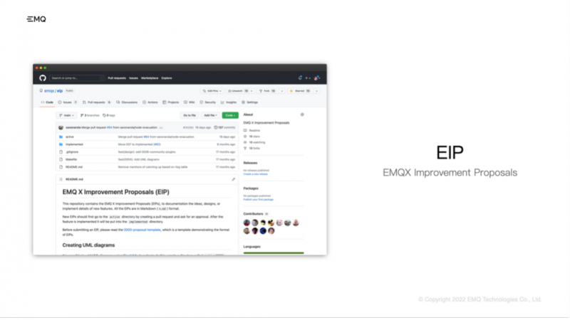 在 EMQX 5.0 絕大部分的重要功能改進中都采用了 EIP 這的方式,記錄一些重大更改的設計過程,這樣除了 EMQ 的研發團隊以外社區的用戶也可以參與到這些重大變更的討論中,來貢獻他們在代碼以外的力量。
