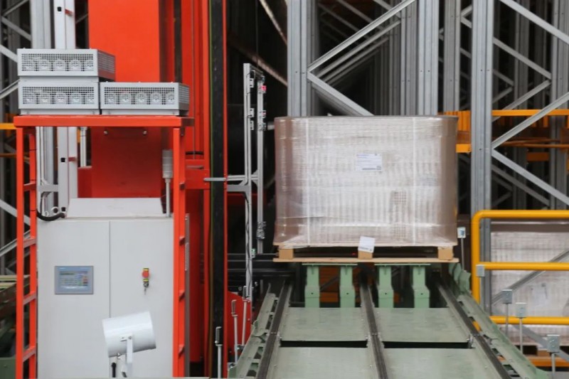 存儲(chǔ)貨架區(qū)配備了18臺(tái)雙立柱堆垛機(jī),其負(fù)載可達(dá)1650公斤,水平運(yùn)行速度可達(dá)120m/min,垂直速度可達(dá)30m/min。輸送至巷道口的托盤就會(huì)由堆垛機(jī)運(yùn)送至對(duì)應(yīng)的貨位上完成存儲(chǔ)。