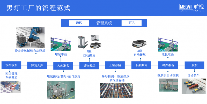 作為深耕行業(yè)的新一代智慧物流服務(wù)提供商,曠視打造了一套面向“黑燈工廠(chǎng)”物流倉(cāng)儲(chǔ)部分升級(jí)的流程范式,實(shí)現(xiàn)從預(yù)約收貨到卸貨入庫(kù)、入庫(kù)準(zhǔn)備、貨物搬運(yùn)、上架存儲(chǔ)、下架搬運(yùn)、出庫(kù)準(zhǔn)備、發(fā)貨的全流程智能化、自動(dòng)化、無(wú)人化。
