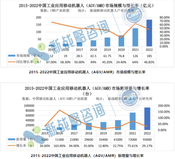作為AGV/AMR的核心器件,AGV/AMR的市場規模決定了控制器的市場規模與空間。根據CMR產業聯盟數據,新戰略移動機器人產業研究所統計,2022年度,中國市場企業整體銷售工業應用移動機器人(AGV/AMR)93000臺,較2021年增長29.17%,市場銷售額達到185億元,同比增長46.83%。