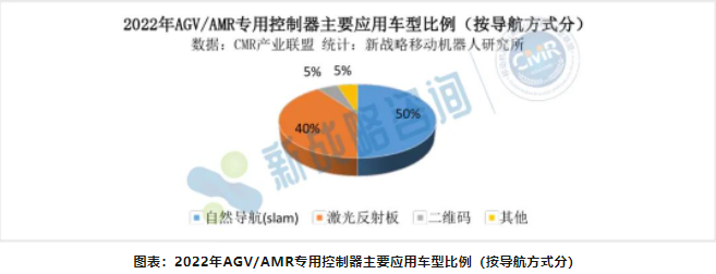 從專用控制器應用的車型來看,自然導航類產品應用AGV/AMR專用控制器最多,由于其應用環境相對復雜,對算法算力要求較高,一般的PLC、單片機及工控機等難以滿足其要求,所以需要專用的控制器;其次是激光反射板AGV,主要以激光反射板叉車為主;二維碼及磁導類應用專用控制器較少,一般的工控機及PLC等即可滿足需求。