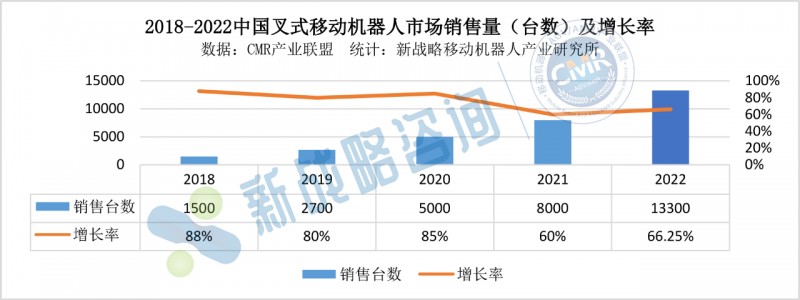 據(jù)CMR產(chǎn)業(yè)聯(lián)盟數(shù)據(jù)、新戰(zhàn)略移動(dòng)機(jī)器人產(chǎn)業(yè)研究所統(tǒng)計(jì),2022年中國叉式移動(dòng)機(jī)器人銷量達(dá)13300臺,同比增長66.25%,市場規(guī)模約為34.68億元,同比增長41.55%。