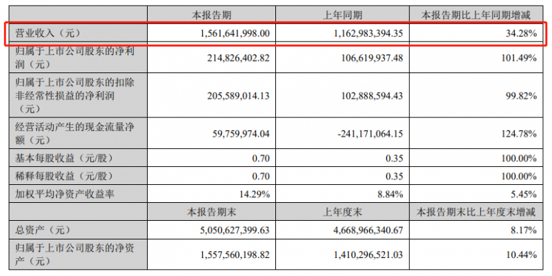今天國際8月22日發布半年度業績報告稱,2023年上半年營業收入約15.62億元,同比增加34.28%;歸屬于上市公司股東的凈利潤約2.15億元,同比增加101.49%;基本每股收益0.7元,同比增加100%。