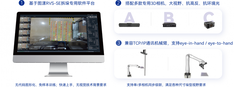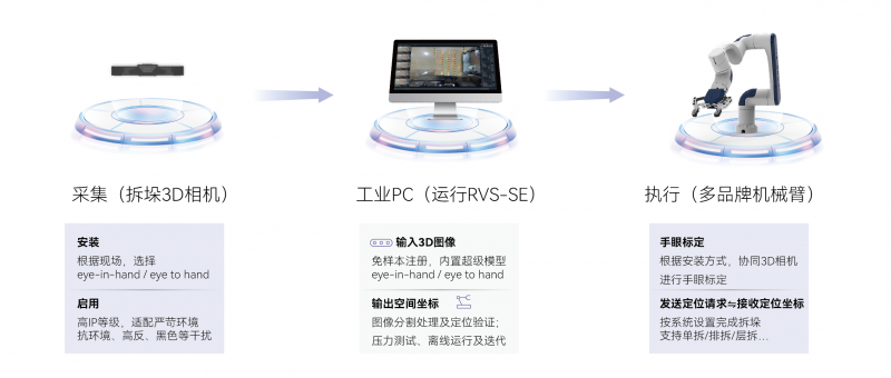 RVS-SE標準拆垛方案產(chǎn)品,由RVS-SE軟件和固定搭配的3D工業(yè)相機組成,用戶可以自選機械臂和前端執(zhí)行部件、工控機。