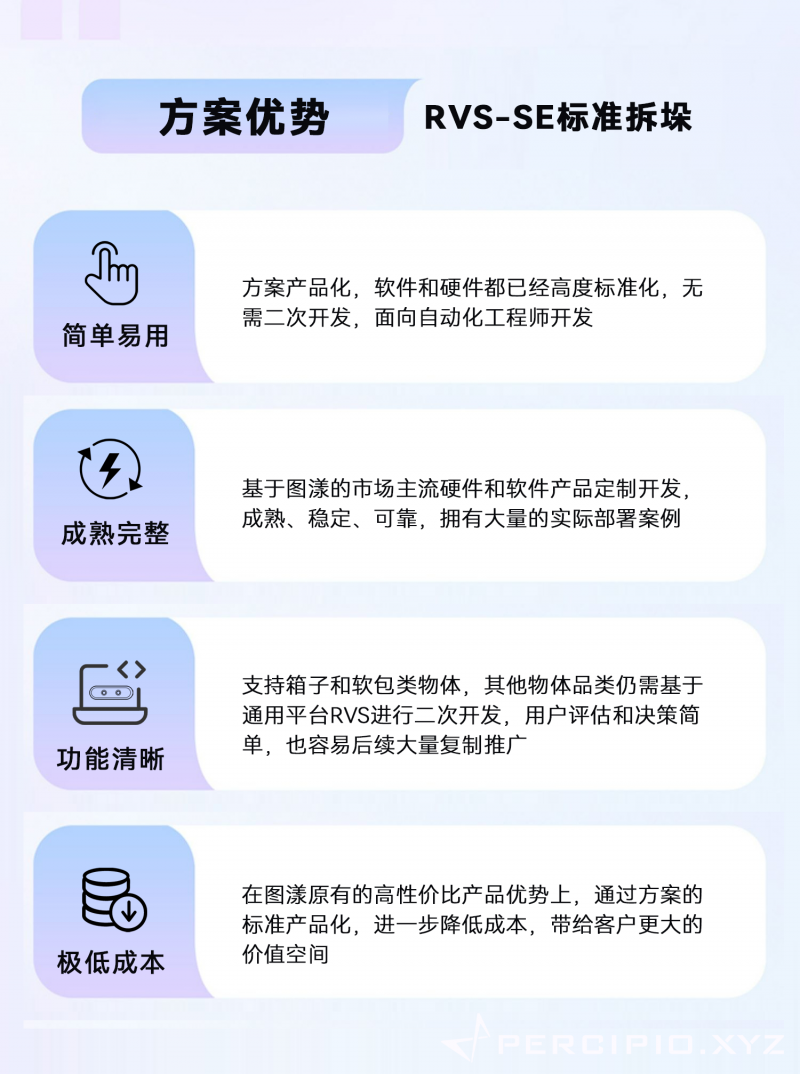 圖漾科技發(fā)布RVS-SE(RVS Standard Edition),面向拆垛類應用提供完整的3D視覺方案標準產(chǎn)品,可與主流工業(yè)機器人配合,無需二次開發(fā)即可輕松完成拆垛工作站的實施與交付。