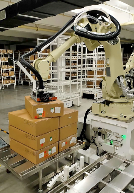 現(xiàn)場了解該客戶產(chǎn)線目前為四款箱型(后續(xù)有新增箱型SKU需求),部分箱型有膜覆蓋、膠帶反光等干擾情形,同時廠房布局緊湊,光照復雜,機器人拾取到放置運轉(zhuǎn)空間小,拆垛系統(tǒng)需具備路徑規(guī)劃與碰撞檢測能力;整體效率要滿足客戶需求,銜接連貫。