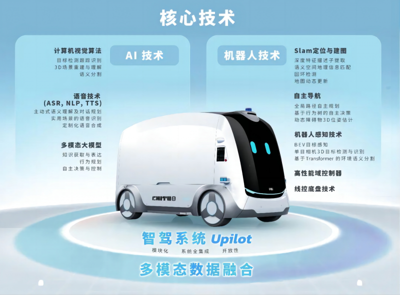 據(jù)了解,Chitu赤兔還搭載了UQI優(yōu)奇自主研發(fā)的智能駕駛系統(tǒng)Upilot,并融合計(jì)算機(jī)視覺算法、語音技術(shù)、多模態(tài)大模型、SLAM定位與建圖、自主導(dǎo)航、高精度感知等“AI+機(jī)器人”技術(shù),達(dá)到國內(nèi)先進(jìn)的L4級(jí)無人駕駛技術(shù)水平。