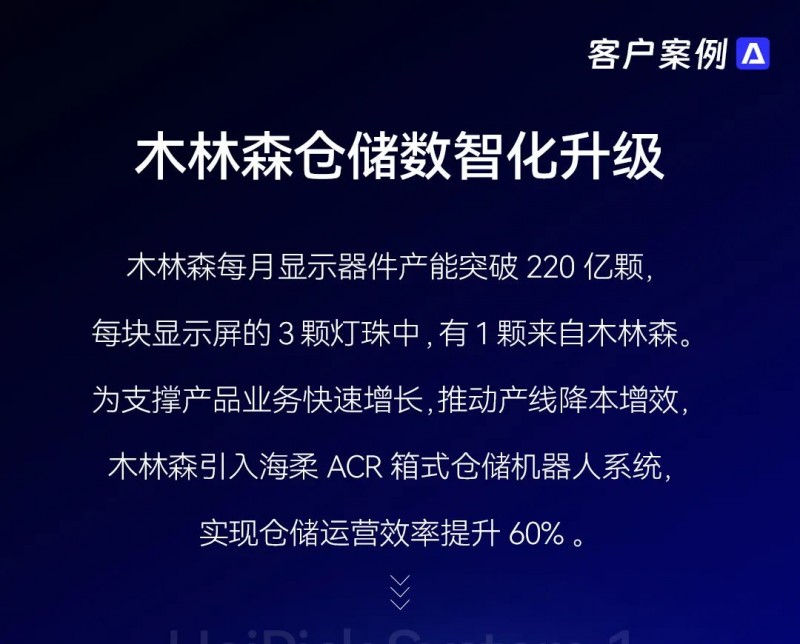 為加強木林森各業(yè)務端的智能化和柔性化水平,公司引進了海柔創(chuàng)新HaiPick System 1,通過以ACR為核心的多種自動化設備,實現(xiàn)產(chǎn)線成品的一體化智能拆垛、自動化出入庫、包裝、碼垛。