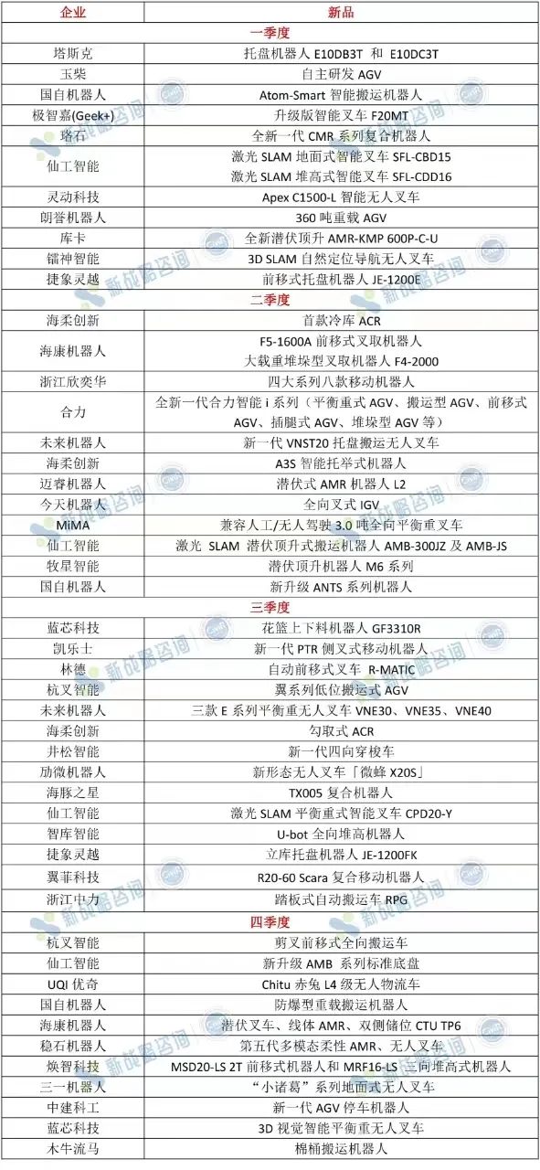 表:2023年AGV/AMR行業新產品(根據公開信息整理,如有未完善之處,請指正!)