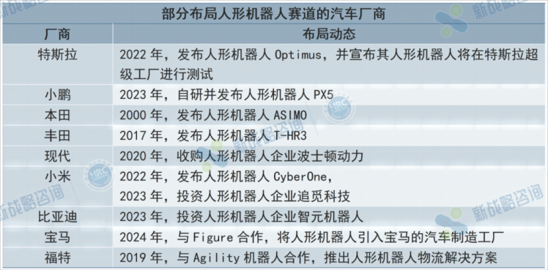除了特斯拉、寶馬、本田和現(xiàn)代汽車(chē)等國(guó)際汽車(chē)制造商,國(guó)內(nèi)越來(lái)越多的車(chē)企也開(kāi)始進(jìn)入人形機(jī)器人領(lǐng)域。在過(guò)去的半年里,多家車(chē)企進(jìn)入了這一領(lǐng)域,如比亞迪投資了人形機(jī)器人初創(chuàng)公司智元機(jī)器人,小鵬汽車(chē)發(fā)布了自主研發(fā)的人形機(jī)器人PX5,小米推出了人形仿生機(jī)器人CyberOne等。
