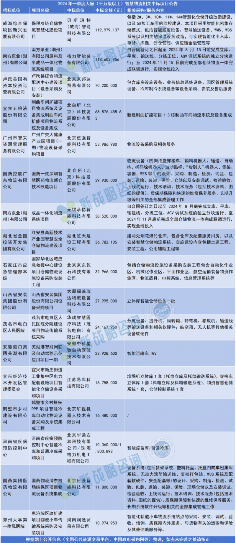 其中,一季度移動機器人領(lǐng)域公開發(fā)布超50項中標公告。從移動機器人領(lǐng)域的中標項目分布情況來看,一季度中標公告主要集中于汽車行業(yè)及工程機械行業(yè)。另據(jù)新戰(zhàn)略移動機器人產(chǎn)業(yè)研究所統(tǒng)計,汽車行業(yè)在2024年一季度釋放超十億元標的。其次是物流倉儲業(yè)。此外,醫(yī)療衛(wèi)生、電子等行業(yè)也有較多招標項目。