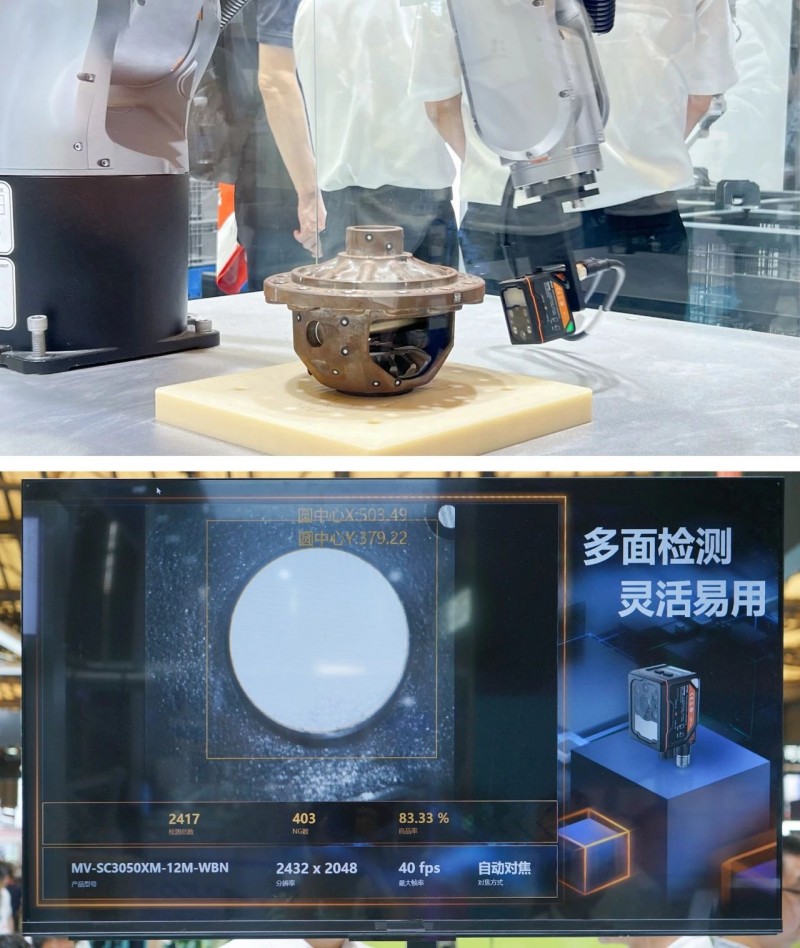 集成像、算法、存儲、通信于一身的SC3000X系列視覺傳感器,體積小巧,外觀緊湊,安裝更加靈活,內(nèi)部嵌入了讀碼、有無、正反、測量、識別和計數(shù)等防錯檢測算法,搭配機(jī)械臂對鑄造件的各個面進(jìn)行碼信息、字符信息的檢測。