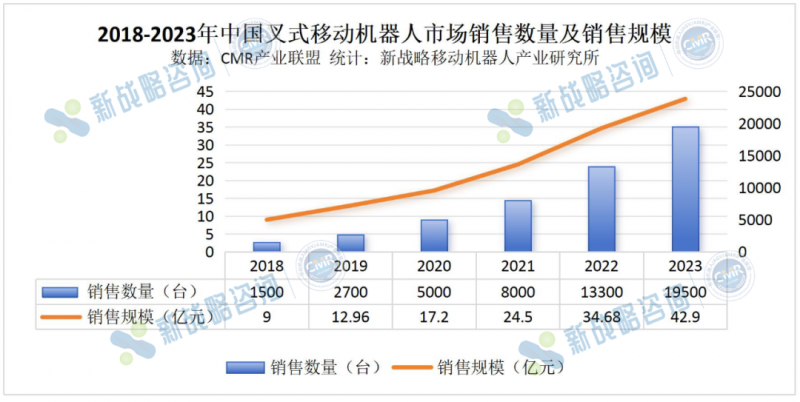 圖表:2018-2023年中國叉式移動機器人市場銷售數量及銷售規模