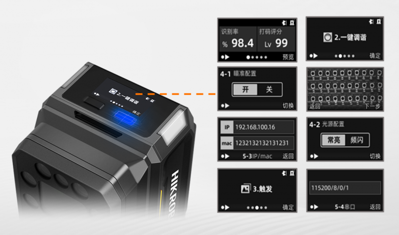 新增OLED顯示屏,通過與按鍵聯(lián)動(dòng),無(wú)需PC即可實(shí)現(xiàn)確認(rèn)主機(jī)信息、讀碼狀態(tài)實(shí)時(shí)查看、讀碼器參數(shù)輕松設(shè)定和快速?gòu)?fù)制等功能。