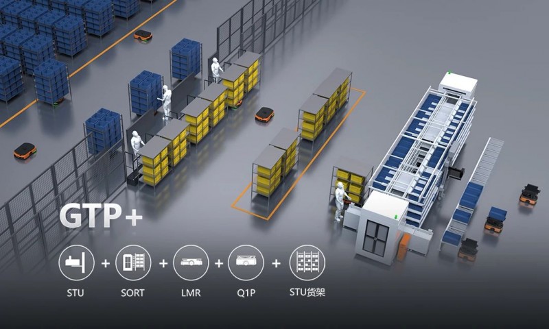 GTP+方案由GTP(Goods to Person,貨架到人方案)總揀、SORT自動分播、對接STU空滿箱交換、Q1P空滿箱轉運構成,適用于醫(yī)藥樓層庫混合拆零揀選場景。