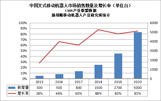 據中國移動機器人(AGV)產業聯盟數據、新戰略移動機器人產業研究所統計,2020年中國叉式移動機器人(含視覺導航)銷量達5000臺,較之于2019年的2700臺增長幅度為85%,市場規模約為17億元,較之于2019年增長31%,其中激光反射板產品約為3400臺。