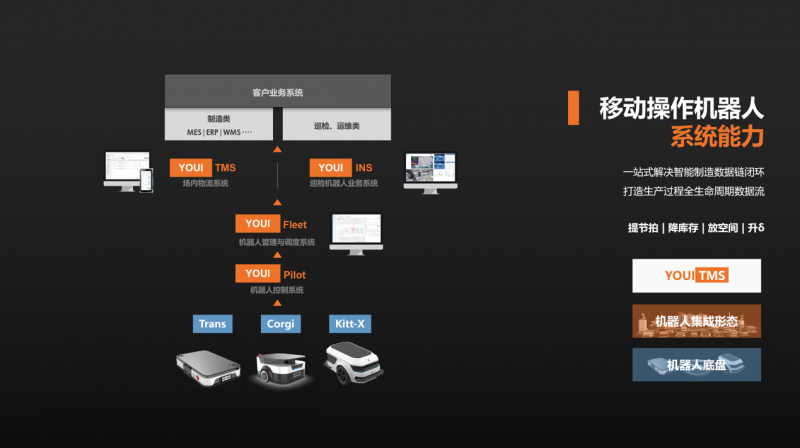 優(yōu)艾智合是國內最早布局軟件系統(tǒng)的移動機器人企業(yè)。以針對制造業(yè)打造的YOUI TMS智慧物流系統(tǒng)為例,其能將移動機器人在工序間的物理流轉升級為數(shù)據(jù)連接,具備根據(jù)ERP、WMS、MES等企業(yè)信息系統(tǒng)進行整體物流自主調度的能力,完成備料倉到產(chǎn)線再至成品倉的物流數(shù)據(jù)全覆蓋。