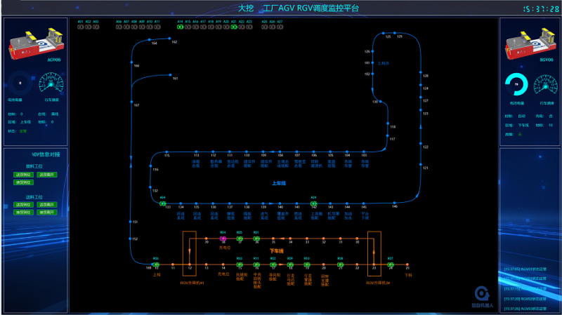 大挖工廠通過融入國自的超重載20噸AGV、30噸RGV車型,在柔性物流裝配線領(lǐng)域內(nèi)實現(xiàn)全局調(diào)度,完成了以下多個技術(shù)應(yīng)用的探索與突破:
