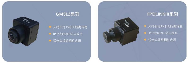 GMSL2系列和FPDlinkIII系列是為車規級相機應用量身定制的兩個系列,涵蓋多款產品,提供諸如HDR、ISP、VCSEL、IR LED、立體雙目技術、3D立體成像等功能,可用于姿勢識別、虹膜掃描、增強現實、眼球跟蹤、機器視覺、IoT、機器人、位置跟蹤、生物測定、虛擬現實等應用中。傳輸距離高達15米。IP防護級別一般為IP67或IP69K,可以有效防塵防水。
