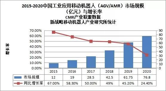 圖:2015-2020中國(guó)工業(yè)應(yīng)用移動(dòng)機(jī)器人(AGV/AMR)市場(chǎng)新增量(臺(tái))與增長(zhǎng)率