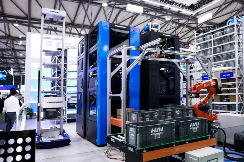展會的一角,專為HAIPICK® 庫寶機器人研發(fā)設計的HAIPORT自動裝卸機配合3臺HAIPICK® A42N紙箱揀選機器人智能對接,現(xiàn)場演示了多貨箱即裝即卸的高效作業(yè)場景。每臺機器人僅需3s即可一次性完成6-8個貨箱的上料,5s完成卸料,較輸送線工作站,機器人裝卸速度提升16倍。