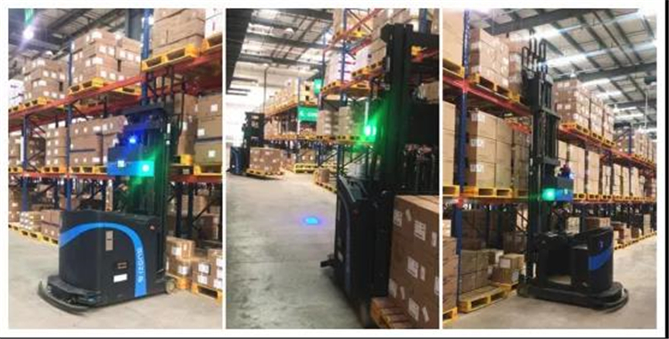 在全球物流巨頭企業的第三方物流倉庫,倉庫內貨架高度7.2m、6000m²作業面積、4000多個倉儲貨位,合力高舉升叉車式AGV用于貨物出入庫搬運,項目已穩定運行第4年。
