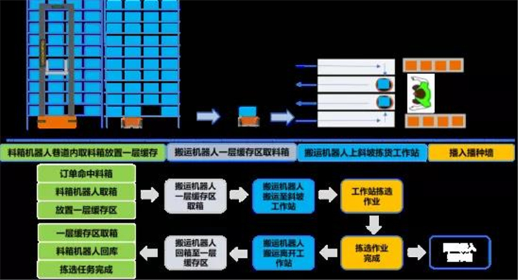 “大工”鴻鵠料箱機器人主要干“蓋樓”的活,系統下達命令后,鴻鵠負責垂直方向的取貨,然后放在一層的緩存架;接下來,由體積小巧靈活的“小工”青鸞干“搬磚”的活,負責水平方向上遠距離的料箱搬運,背負料箱送至工作站。人只需要從料箱內揀貨即可。