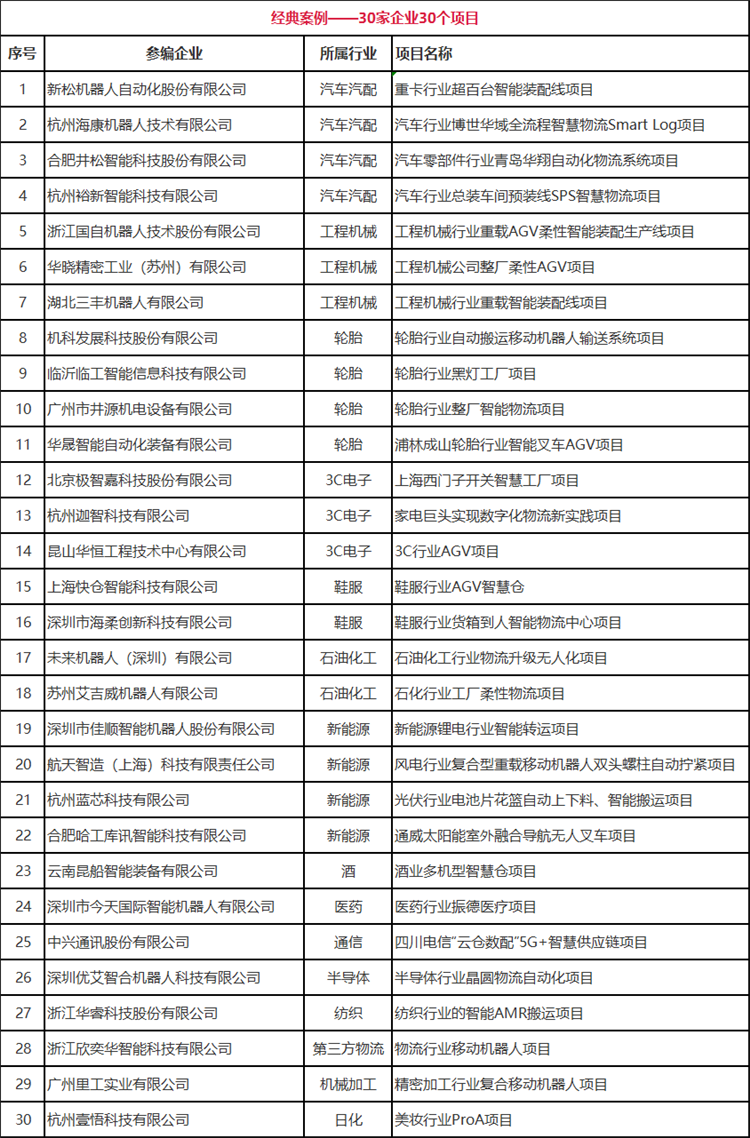 為了更好的宣導(dǎo)和展示從91年國產(chǎn)AGV落地應(yīng)用以來在各行各業(yè)的經(jīng)典案例,以及將案例與技術(shù)相結(jié)合,凸顯行業(yè)前瞻技術(shù)的論文集萃。中國移動(dòng)機(jī)器人(AGV/AMR)產(chǎn)業(yè)聯(lián)盟與新戰(zhàn)略移動(dòng)機(jī)器人產(chǎn)業(yè)研究所聯(lián)合出版了《中國工業(yè)應(yīng)用移動(dòng)機(jī)器人經(jīng)典案例匯編及技術(shù)發(fā)展論文集(2021版)》。具體入選案例名錄如下: