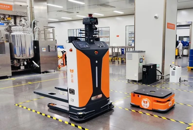 同時,由Gulf-1400-CDD無人叉車機器人負(fù)責(zé)原材料從原料倉到乳化車間的搬運、空桶的產(chǎn)線返回、半成品從產(chǎn)線到車間的中轉(zhuǎn)、包材的產(chǎn)線搬運,搭配FMS調(diào)度管理系統(tǒng),實現(xiàn)最優(yōu)任務(wù)分配方案,讓倉儲物流整體效能最大化。