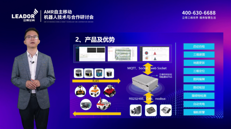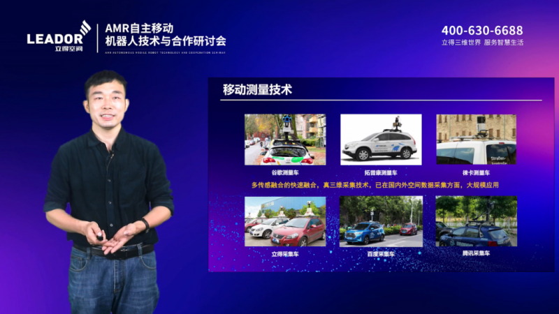 立得空間董事長郭晟在研討會上致辭并發(fā)表演講。他介紹說,“立得空間成立23年來基于移動測量、慣性導(dǎo)航、高精地圖、時空大數(shù)據(jù)等先進(jìn)技術(shù)推動相關(guān)產(chǎn)業(yè)變革。近年來,立得空間與機(jī)器人廠商、OEM生態(tài)合作伙伴共同努力,在移動機(jī)器人領(lǐng)域獲得了新的突破。通過‘INS(慣性導(dǎo)航系統(tǒng))+SLAM’算法可以使機(jī)器人獲得高精度的定位和導(dǎo)航能力,通過“真圖”數(shù)字孿生工廠平臺,對機(jī)器人的運行進(jìn)行模擬仿真,從而使其在實際投用后可以更精準(zhǔn)、可靠地完成任務(wù)。智能物流、倉儲、安保、應(yīng)急、特種行業(yè)的智能應(yīng)用相繼落地。”