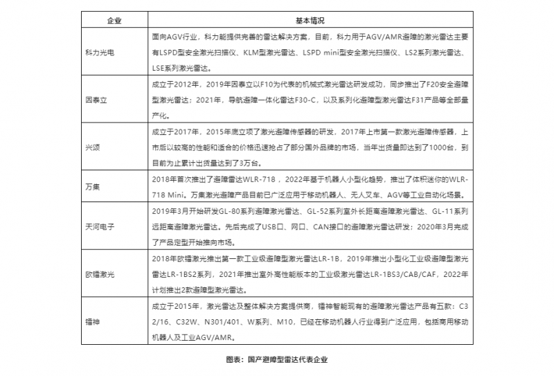 早期國(guó)內(nèi)AGV/AMR行業(yè),無(wú)論是避障型還是導(dǎo)航型雷達(dá)都以外資品牌應(yīng)用為主,但從2015年左右開(kāi)始,伴隨著整個(gè)國(guó)內(nèi)AGV產(chǎn)業(yè)的發(fā)展,國(guó)產(chǎn)激光雷達(dá)也迎來(lái)了發(fā)展機(jī)遇期,出現(xiàn)了一批代表企業(yè),尤其是在避障型雷達(dá)方面,在這些激光雷達(dá)廠商的努力下,已經(jīng)基本實(shí)現(xiàn)了國(guó)產(chǎn)化,取得了重大的突破。