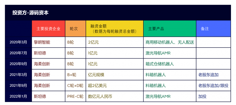 2020年至2021年,在移動機器人行業,源碼資本參與了7起融資案件,每輪融資總金額均為億元級規模。