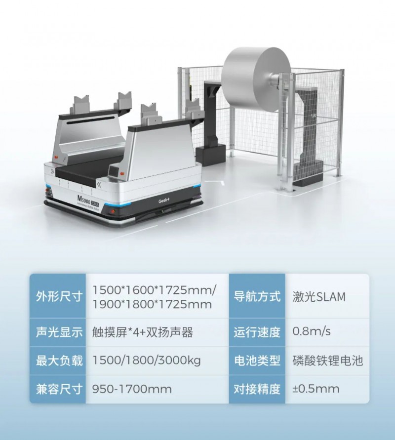 極智嘉雙舉升機(jī)器人采用激光傳感器,融合視覺(jué)算法,實(shí)現(xiàn)與機(jī)臺(tái)、緩存架的精準(zhǔn)對(duì)接,各向?qū)泳瓤蛇_(dá)±0.5mm。搭配使用光電傳感器,可識(shí)別出料軸在叉臂上發(fā)生的位置偏移,并調(diào)整動(dòng)作自動(dòng)糾偏,有效防止拖料、掉料,降低安全風(fēng)險(xiǎn)和生產(chǎn)損失。
